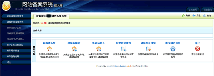 输入备案用户名和密码即可进入到备案系统.三种方式进入的备案系统界面都一样.如下图: